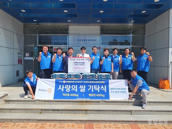 충북혁신로타리클럽(회장 정영훈)은 10일 덕산읍 행정복지센터(읍장 강상훈)를 방문해 지역내 저소득 취약계층을 위한 백미 400㎏를 기탁했다. 진천군