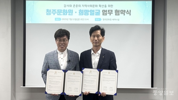 청주문화원(강전섭 원장)과 희망얼굴연구소(지선호 소장)가 지난 11일 체결식을 통해 지역사회에 따뜻한 문화의 씨앗을 함께 심어가기로 뜻을 모았다.