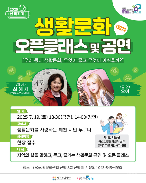 제천문화재단(이사장 김상수)은 오는 19일 하소생활문화센터 산책 3층 산책홀에서 2025 생활문화 네트워크 구축 ‘산책 지기’ 사업의 일환으로 1회차 생활문화 오픈 클래스를 한다.