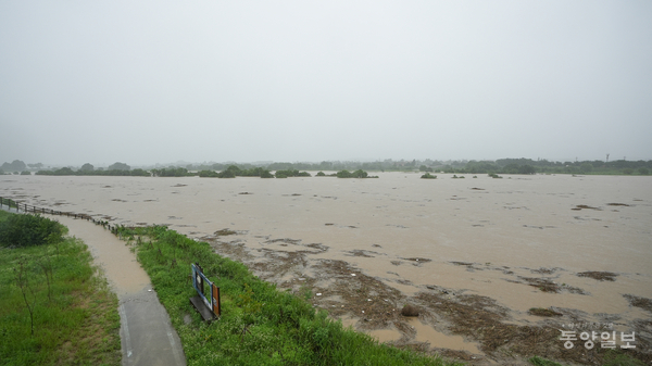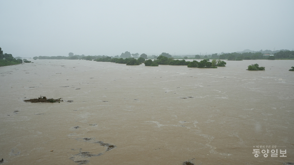 강한 호우가 내린 17일 청주시 청원구 외하동 팔결교에서 바라본 미호강의 모습은 강물의 수위가 높아져 강변 곳곳이 물에 잠겨 범람위기가 고조되고 있다. 손상훈 기자 mjsh9370@dynews.co.kr