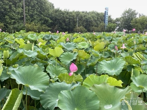 증평민속체험박물관의 야외 연못에 연꽃이 활짝 피어 절정을 이뤄 관람객들로부터 인기를 모으고 있다. 17일 폭우가 내리는 가운데서도 연꽃이 고고한 자태를 뽐내고 있다. 증평군