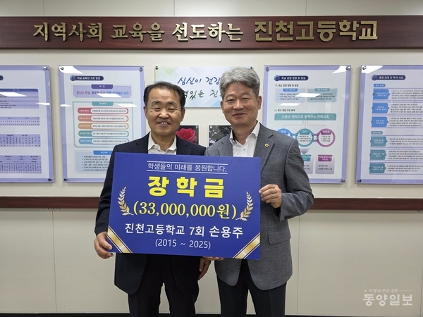 손용주 지엔에이치 대표가 17일 진천고(교장 오남진)를 찾아 교장실에서 장학금 300만원을 전달했다. 손 대표는 11년째 장학금을 전달하고 있다. 진천교육지원청