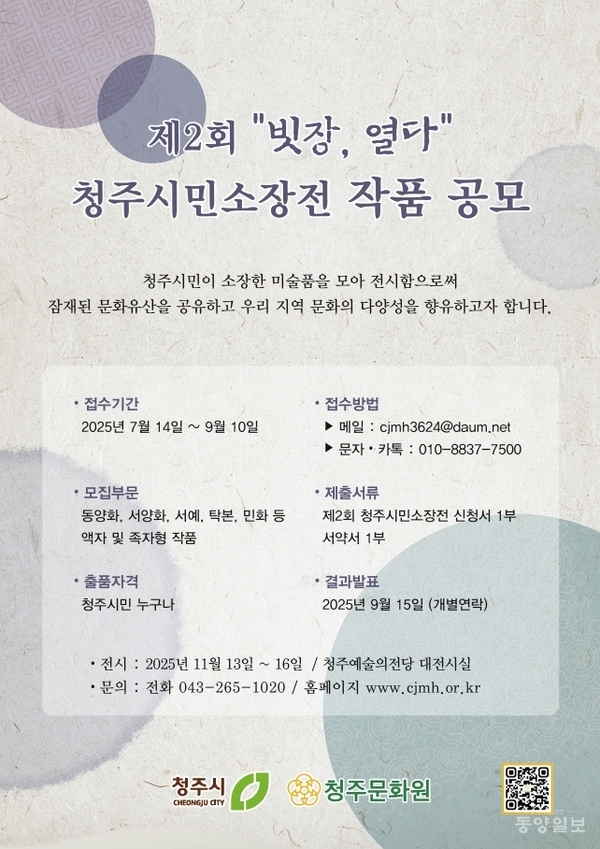 청주문화원(원장 강전섭)은 지난 14일~9월 10일 2회 청주시민소장전 ‘빗장, 열다’의 작품 공모 온라인 접수를 시작했다. 청주시민소장전은 청주시민이 소장한 미술품을 모아 전시함으로써 잠재된 문화유산을 공유하고 우리 지역 문화의 다양성을 향유하기 위해 기획된 시민참여형 사업이다.