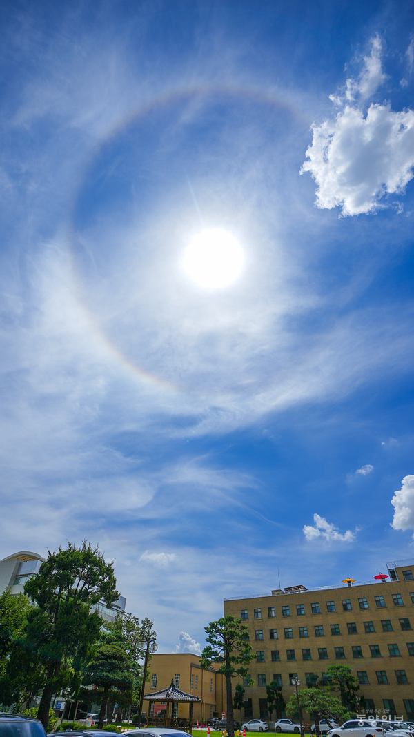 낮 기온 34도까지 오른 22일 청주시 충북도청 하늘에 해무리 현상이 나타나 눈길을 끌고 있다. 해무리는 대기 중 수증기가 굴절돼 태양 주변으로 둥근 고리처럼 보이는 일종의 무지개다. 손상훈 기자 mjsh9370@dynews.co.kr