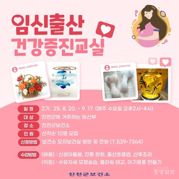 진천군이 임신부를 대상으로 행복한 태교와 건강한 출산 교육을 위한‘임신부 출산·건강 증진 교실’을 운영한다.