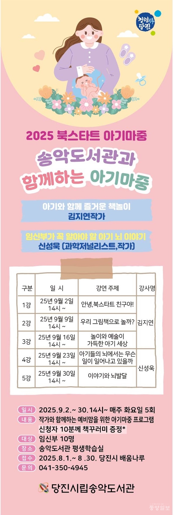 당진시립도서관(관장 최명용)은 송악도서관에서 ‘북스타트 아기마중’ 사업 참여자를 8월 1일부터 모집한다.<사진>