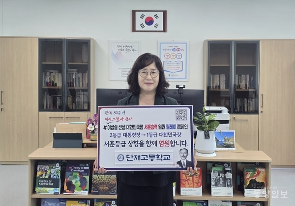 정관숙 단재고 교장이 4일 독립운동가 보재 이상설 선생의 대한민국장 서훈 승격을 염원하는 릴레이 캠페인에 동참했다.<사진>