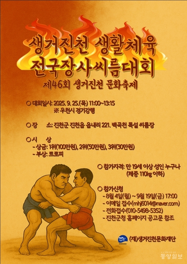 진천군 (재)생거진천문화재단이 46회 생거진천 문화축제를 맞아 ‘생거진천 생활체육 전국장사씨름대회’ 참가자를 9월 19일까지 모집한다.
