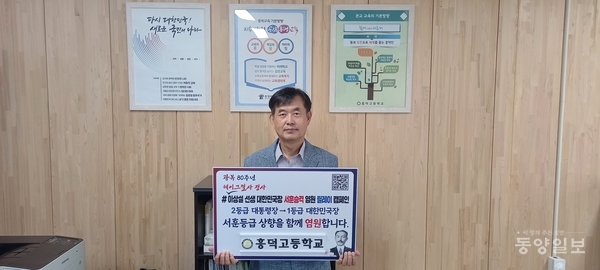 최동일 흥덕고 교장이 6일 광복 80주년을 맞아 진행되는 이상설 선생의 서훈 승격 염원을 담은 캠페인에 동참했다.<사진>