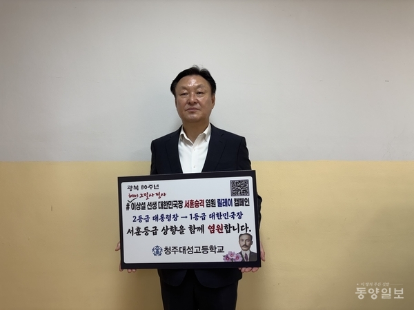 박일순 대성고 교장이 8일 광복 80주년을 맞아 진행되고 있는 ‘이상설 선생 서훈 승격 염원 릴레이 캠페인’에 참여했다.<사진>