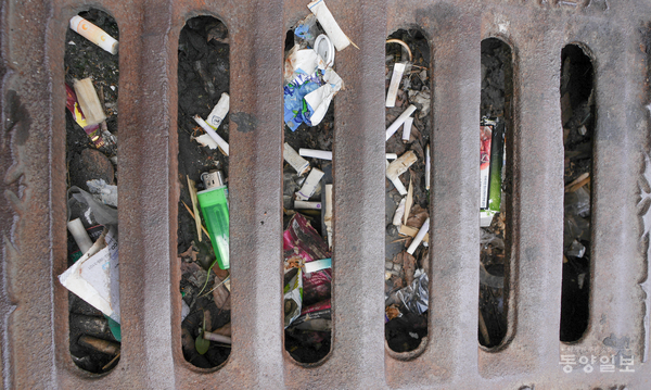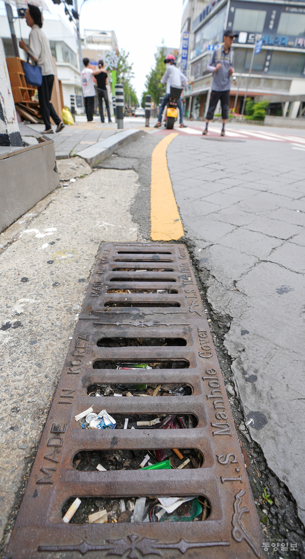 최근 잦은 소나기로 빗물받이 관리 필요성이 커지는 가운데, 10일 청주시 상당구 서문동 로데오거리의 한 빗물받이 하수구가 쓰레기와 담배꽁초 등 오물로 막혀있다. 손상훈 기자 mjsh9370@dynews.co.kr