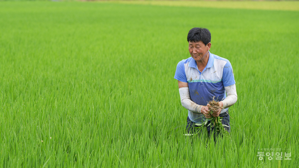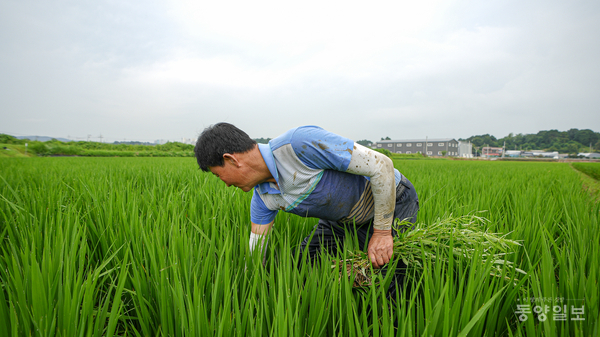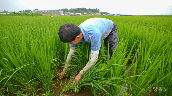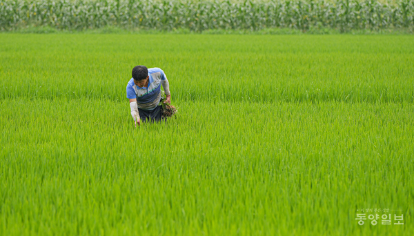 본격적인 여름철 농번기가 시작되는 11일 청주시 청원구 오창읍 서우리의 들녘에서 한 농부가 김매기 작업으로 손길이 분주하다. 손상훈 기자 mjsh9370@dynews.co.kr