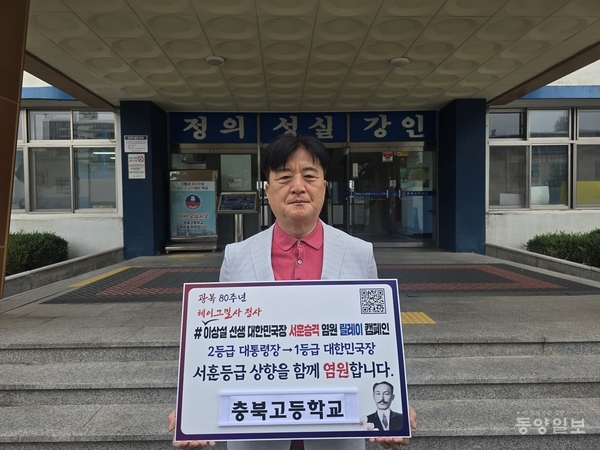 홍순두 충북고교장이 11일 독립운동가 보재 이상설 선생의 서훈 승격을 염원하는 릴레이 캠페인에 동참했다.<사진>