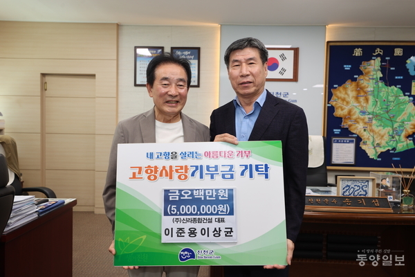 ㈜신라건설 이상균·이준용 대표는 12일 진천군에 고향사랑기부금 500만원을 전달했다. 이날 전달식에는 박관순(우측) 이사가 대신 참여했다. 진천군