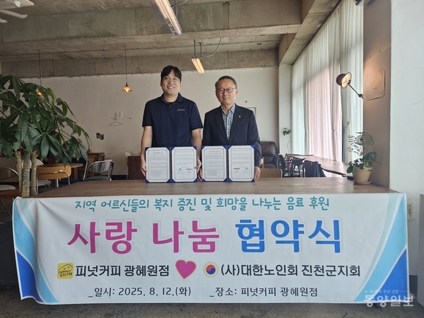 진천군 피넛커피 광혜원점(대표 윤덕규)은 12일 (사)대한노인회 진천군지회 박승구 지회장과 직원들이 참석한 가운데 어르신들에게 음료를 제공하는 ‘어르신 음료 후원 협약식’을 체결했다. 진천군