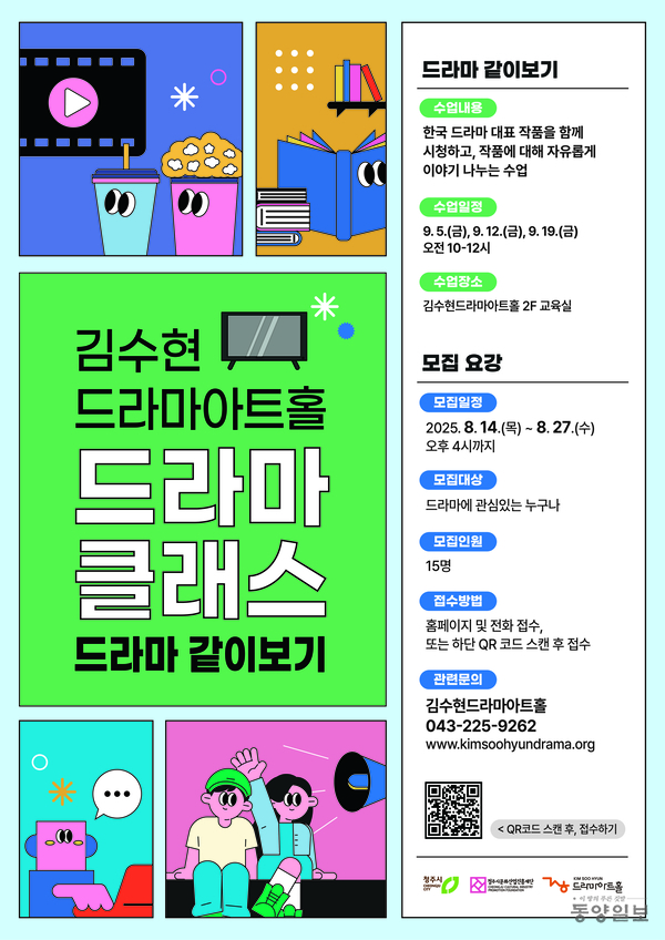 드라마를 사랑하는 시민이라면 누구나 참여할 수 있으며, 참가비는 무료다. 참여 신청은 드라마아트홀 누리집이나 전화 접수(☎043-225-9262)를 이용하면 된다. 추첨을 통해 최종 참여자 15명을 선정하며 선정 결과는 내달 1일 개별 통보된다. 박현진 기자 artcb@dynews.co.kr
