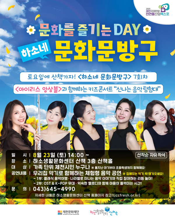 제천문화재단(이사장 김상수)은 오는 23일 하소생활문화센터 산책에서 ‘하소네 문화문방구’ 7회차 프로그램 클래식 연주단체 아이리스 앙상블과 함께하는 키즈 콘서트 ‘신나는 음악 탐험대’를 한다.