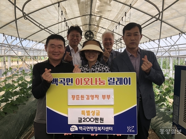 진천 백곡면 유곡마을 황준원·김영자 부부가 어려운 이웃을 위해 써달라며 20일 백곡면행정복지센터를 찾아 200만원을 기탁했다. 진천군
