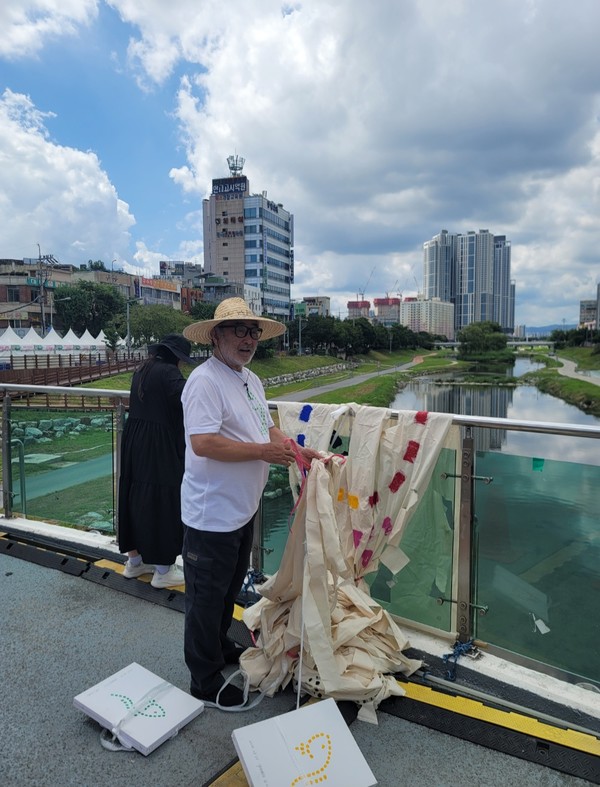 광복과 분단 80주년을 맞은 지난 15일, 대전 목척교에서 특별한 플래시 전시가 펼쳐졌다. 허진권 작가는 이날 오후 2~4시까지 짧지만 강렬한 퍼포먼스성 전시 ‘Bridge to River’를 통해 예술로 평화와 통일의 메시지를 전했다.