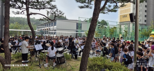 초록길을 따라 이어진 무대에서는 다양한 악기와 맑은 목소리가 어우러져 자연과 생명, 그리고 미래에 대한 희망을 주제로 한 연주가 펼쳐졌으며, 학생과 교직원, 학부모, 지역 주민들이 음악과 함께 하루를 따뜻하게 시작했다.