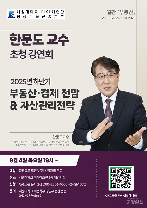 이번 특강은 충북 도민이면 누구나 신청 가능하며, 선착순 150명에 한해 사전 접수를 받는다. 수강 신청과 문의는 서원대 비전학부 경영부동산전공(☎043-299-8484)으로 하면 된다.