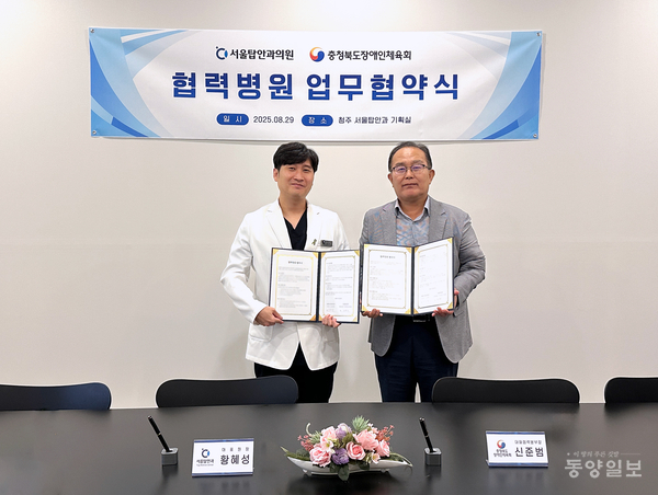 충북장애인체육회와 청주서울탑안과가 지난 29일 협력병원 업무협약을 했다.