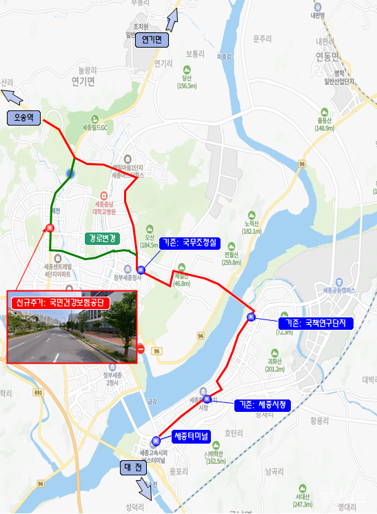 세종시는 1일부터 시외버스와 고속버스 노선에 국민건강보험공단(아름동, 고운동)과 정부세종제2청사(나성동) 정류소를 중간 정차지로 새롭게 추가 운영한다.