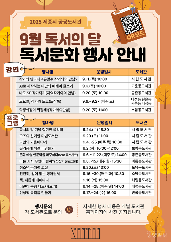 세종시 시립도서관이 9월 독서의 달을 맞아 공공도서관 15곳에서 시민 독서 문화 확산을 위한 각양각색의 독서문화 행사를 운영한다.