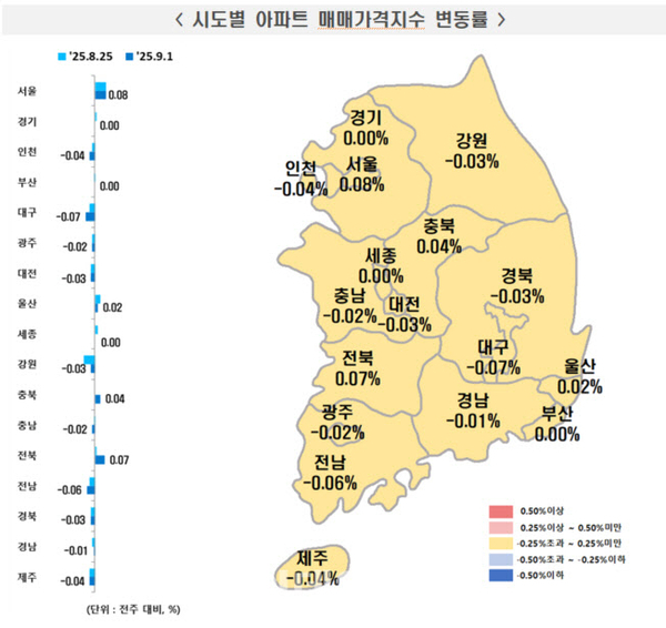 4일 부동산원이 발표한 9월 첫째 주(8월 26일~9월 1일) 전국 주간 아파트 매매가격은 보합(0.00%) 유지됐다. 수도권(0.03%→0.02%)은 상승폭이 축소, 지방(-0.02%→-0.02%)은 하락폭이 유지됐다. 5대광역시(-0.02%→-0.03%)는 하락폭이 확대, 세종(0.02%→0.00%)은 상승에서 보합으로 전환, 8개도(-0.02%→-0.01%)는 상승폭이 소폭 줄었다.