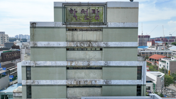청주시 미래유산으로 지정된 옛 학천탕 건물이 경영난으로 수리·보수를 못해 흉물스럽게 변해가고 있다.