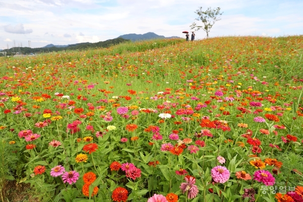 조성된 꽃밭은 산책로와 어우러져 무더운 여름을 보낸 시민들에게 자연 속에서 힐링할 수 있는 공간을 제공하고 있다.