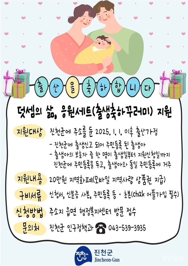 군은 ‘덧셈의 삶, 응원세트 출생축하 꾸러미 지원사업’을 통해 진천군 출생아 가정에 20만 원 상당의 지역화폐를 지급한다고 밝혔다.