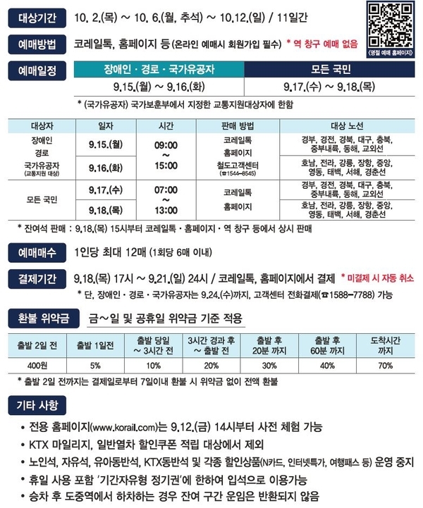 예매 대상은 오는 10월 2~12일 추석 연휴 기간에 운행하는 열차이며 온라인, 전화 등의 비대면 방식으로 진행된다.