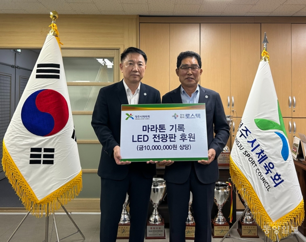 신승진 ㈜로스텍 대표가 15일 청주시체육회에 23회 청원생명쌀대청호마라톤대회에서 사용할 기록 LED 전광판 2대(1000만원 상당)를 후원했다.