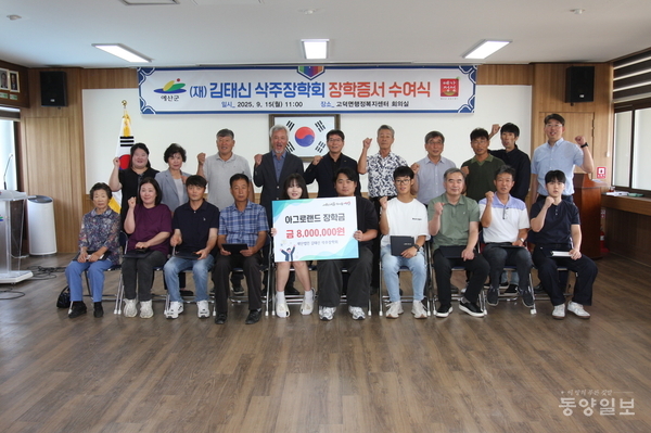 (재)김태신 삭주장학회(이사장 김영배, 태신목장)가 15일 예산군 고덕면 행정복지센터에서 ‘아그로랜드(태신목장) 장학금’을 전달했다.