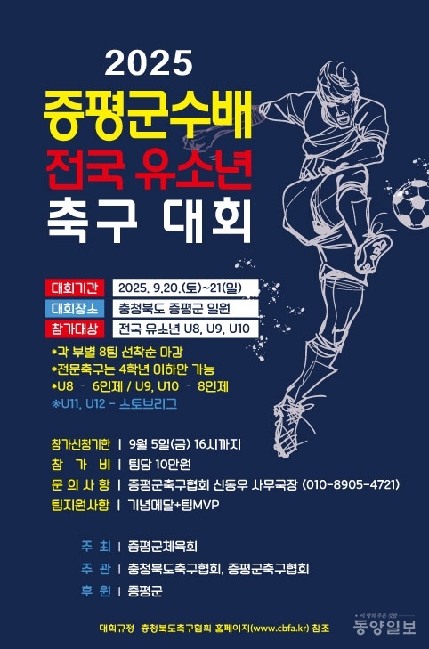 대회는 19일 오후 4시부터 8시까지 증평종합운동장에서 열리는 U11ㆍU12 스토브리그를 시작으로, 21일까지 증평대교 잔디구장에서 U9ㆍU10, 증평풋살경기장에서 U8 대회가 이어진다.