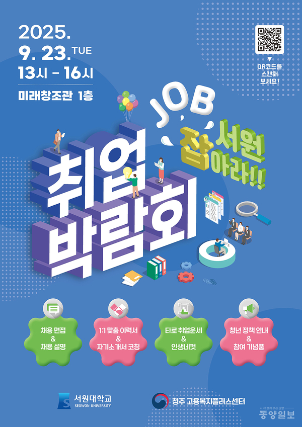 서원대(총장 손석민)가 오는 23일 미래창조관 1층에서 청주고용복지플러스센터와 함께 ‘2025 서원 잡(JOB)아라 취업박람회’를 연다.