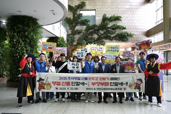 충남 천안시와 천안시청공무원노동조합는 22일 시청 로비에서 추석 명절을 앞두고 ‘명절선물 안 주고 안 받기 청렴캠페인’을 펼쳤다.
