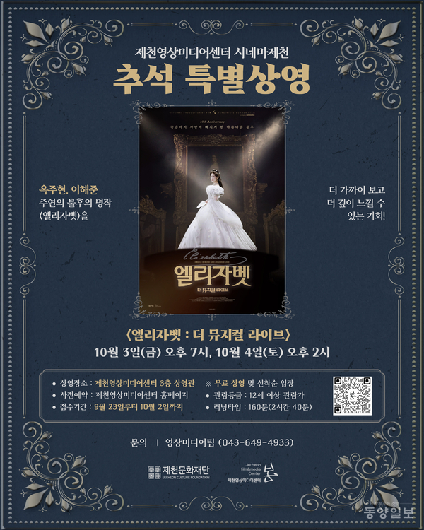 제천문화재단(이사장 김상수)이 추석 연휴 기간인 오는 10월 3일 오후 7시와 10월 4일 오후 2시, 제천영상미디어센터 3층 상영관에서 옥주현 주연의 뮤지컬 공연 실황 영화 ‘엘리자벳 : 더 뮤지컬 라이브’를 무료 상영한다.