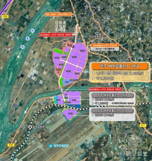 청주 에어로폴리스 3지구는 청주시 청원구 북이면 내둔·화상·화하리 일원에 112만9000㎡(약 34만 평) 규모로 조성되는 항공산업 특화단지다.