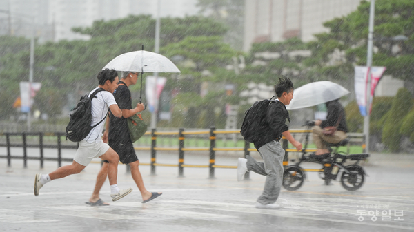 24일 청주시 청원구 율량동에서 시민들이 갑작스럽게 내린 집중호우에 발걸음을 재촉하고 있다. 손상훈 기자 mjsh9370@dynews.co.kr
