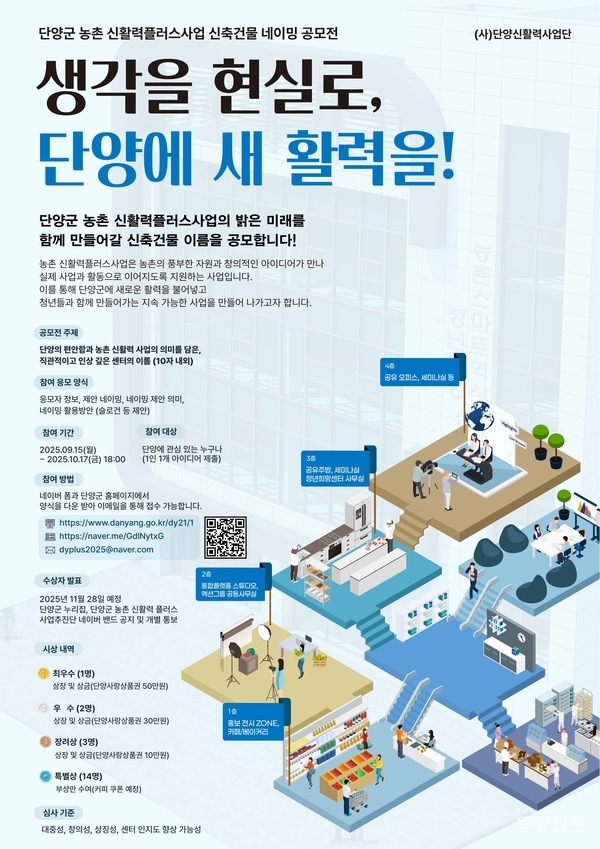 이번 공모는 지역 주민과 청년이 함께 활력을 불어넣고 지속 가능한 성장 사업을 만들어갈 거점 공간에 단양의 정체성을 담은 이름을 부여하기 위해 마련됐다.