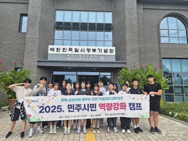 진천교육지원청은 24일 청남대에서 진천군내 초·중학교 학생자치회 대표 20여 명이 참여해 대통령 기념관 등을 돌아보며 민주주의 역사와 의미를 체험하는 ‘민주시민 역량강화 캠프’를 열었다. 진천교육지원청