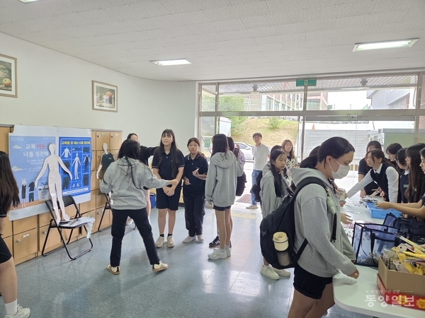 증평여중(교장 민현숙)은 24일 학생자치회의 주관으로 전교생에게 등교 맞이 행사중 하나인 ‘교복 아는 너를 칭찬해’를 진행했다. 괴산증평교육지원청