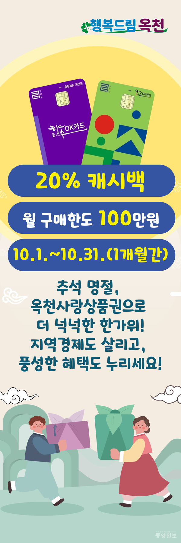 옥천군이 추석 명절을 맞아 군민 소비 촉진과 지역경제 활성화를 위해 10월 한 달간 향수OK카드(옥천사랑상품권)의 캐시백 혜택을 기존 15%에서 20%로 상향 지원한다.