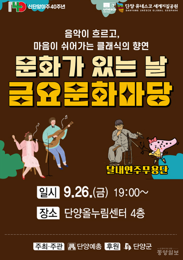 단양군은 26일부터 오는 12월까지 매월 마지막 금요일 오후 올누림센터 4층 강당에서 ‘2025 문화가 있는 주간 금요문화마당’을 운영한다.