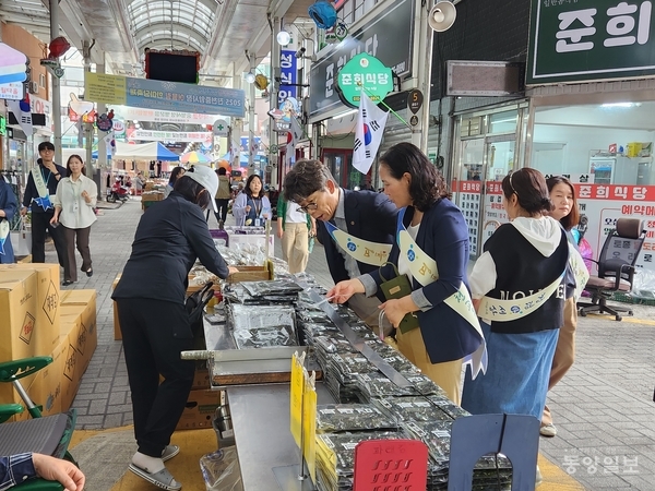 진천교육지원청은 25일 진천 전통시장을 찾아 직원들이 추석 장보기 행사와 청렴 캠페인을 벌였다. 진천교육지원청