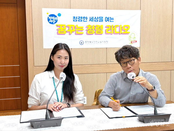 김사명 진천교육장이 29일 새내기 직원과 함께 3회 ‘꿈꾸는 청렴 라디오’에 DJ로 참여해 청렴 소식과 다양한 주제의 청렴 콘텐츠를 청내 방송을 통해 전달하고 있다. 진천교육지원청