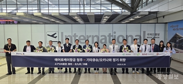 청주공항 거점항공사 에어로케이항공은 지난달 30일 청주발 일본 기타큐슈·오키나와 노선 공동 취항식을 열었다.