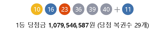 당첨 번호 6개를 모두 맞힌 1등 29명은 각각 10억7954만6587원을 받는다.